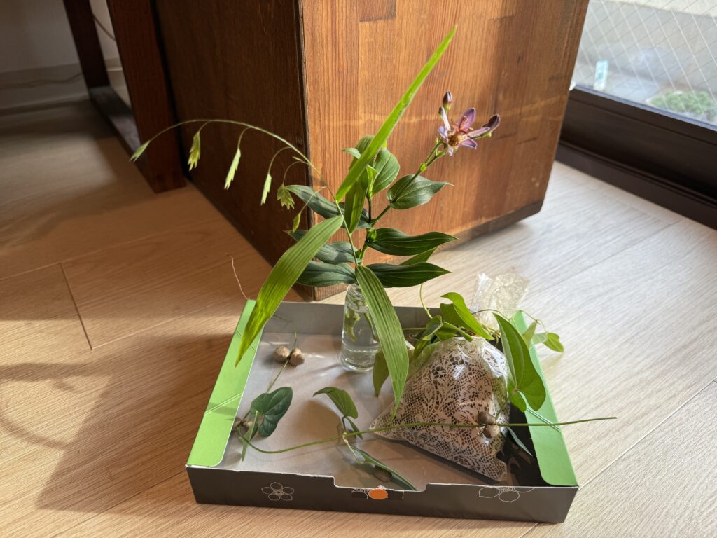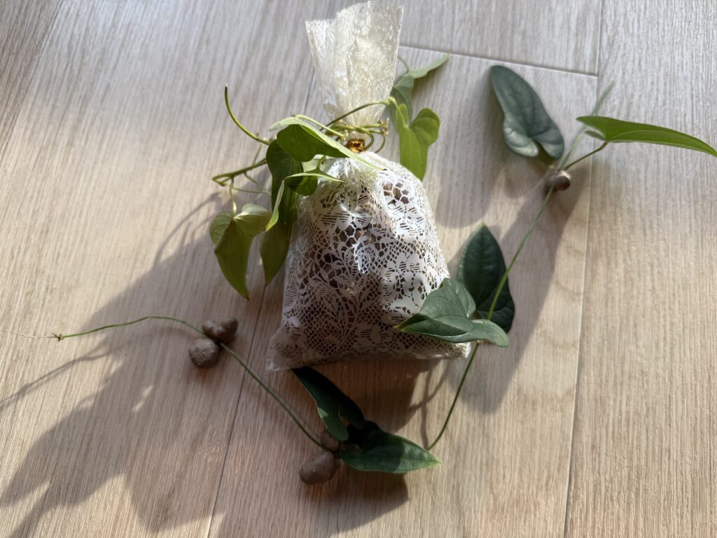 袋の口にむかごの蔓が巻いてある!さすがSさん。